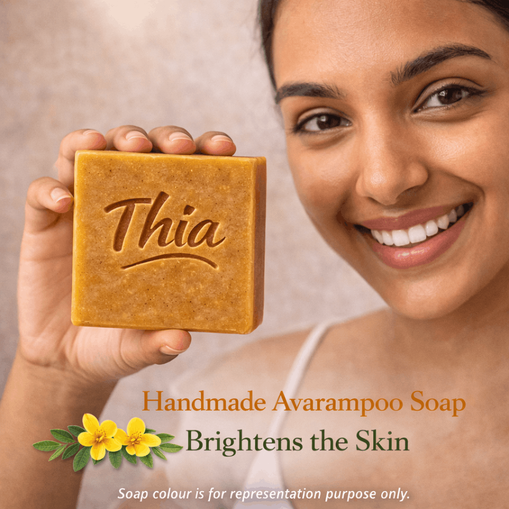 Experience traditional herbal skincare with Thia Naturals Premium Handmade Avarampoo Soap, enriched with the natural goodness of Avarampoo, a time-honored Ayurvedic flower known for its skin-brightening and cooling properties.
